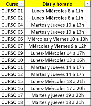 Los alumnos que tengan necesidad de cambiar el curso deberán hablar con el docente a cargo del curso al que quieren asistir el primer día de clase. El docente puede aceptar o rechazar su incorporación de acuerdo a la disponibilidades del curso.